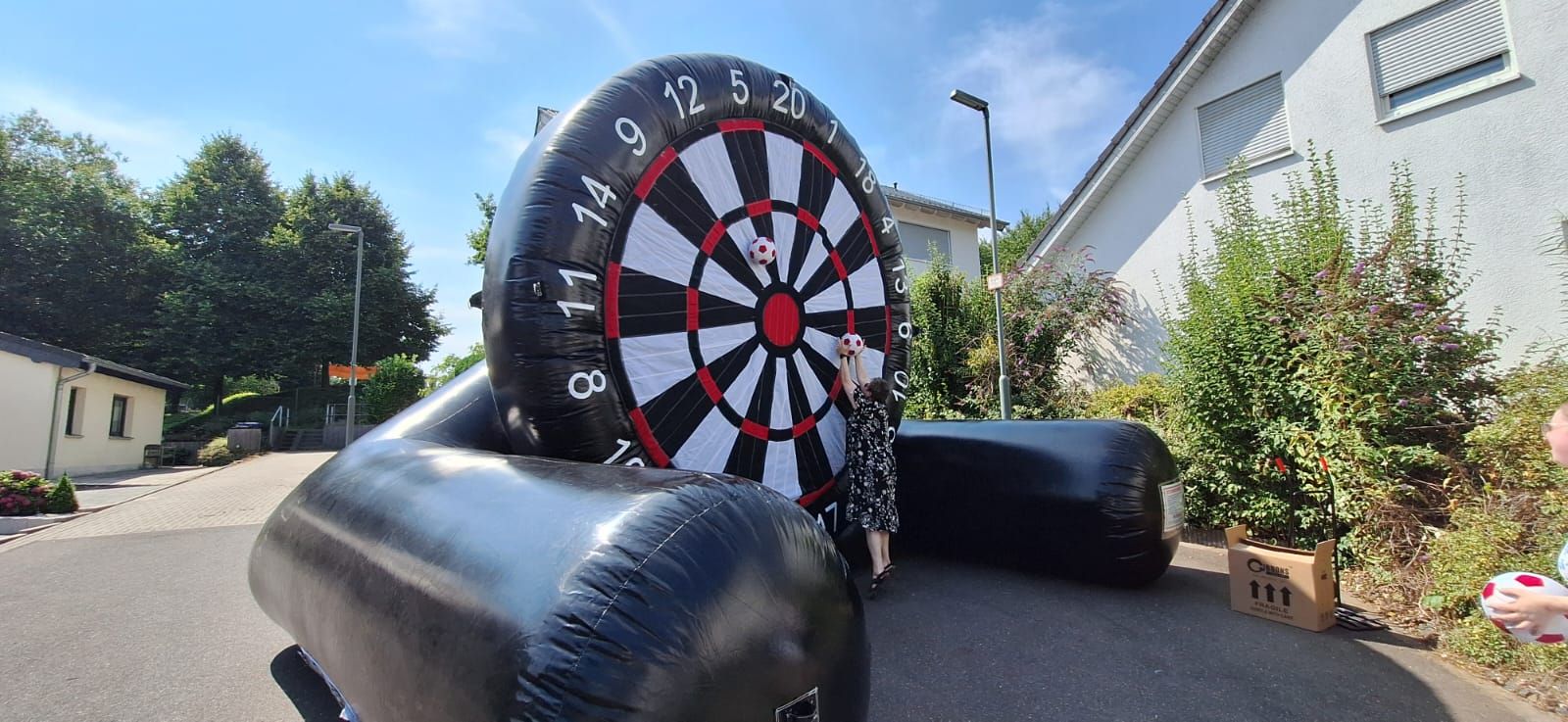 Unser großes aufblasbares Fußball Dart Spiel ist 4,5 Meter hoch und bietet damit einen tollen Eyecatcher auf jeder Fußball-Veranstaltung. Lass Freunde, Gäste, Kunden, Kollegen oder deine Familie beim Soccer Darts gegeneinander antreten und findet heraus wer der beste Schussprofi unter euch ist. Die Spieler können mit üblicherweise drei Versuchen entweder den Ball so nah wie möglich am Bullseye zu platzieren oder eine bestimmte Punktzahl zu „erschießen“. Nicht nur die Mitspieler fiebern da mit, auch die Zuschauer werden gespannt zusehen.